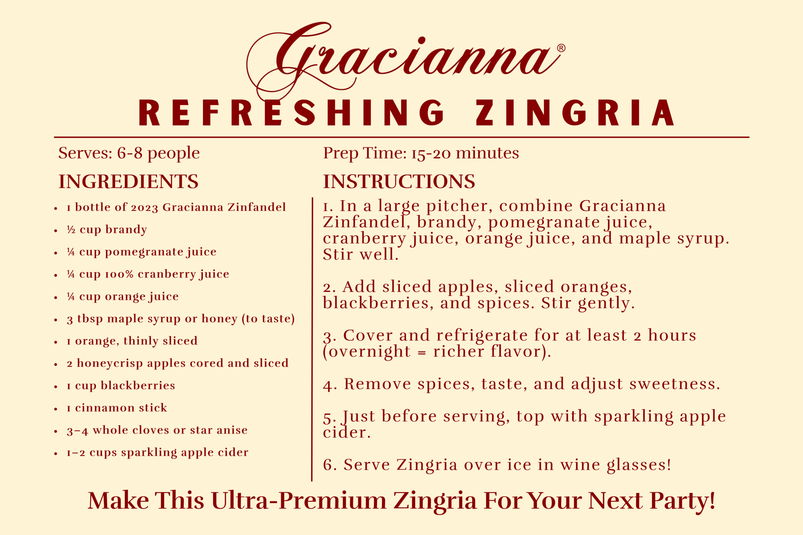 We have developed this delicious and refreshing new cocktail for you to try at your next gathering! It uses Gracianna Zinfandel and makes a zesty new kind of Sangria – the Zingria! Try it out and let us know what you think!